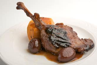 שוק אווז ברוטב שזיפים על מצע בטטה
